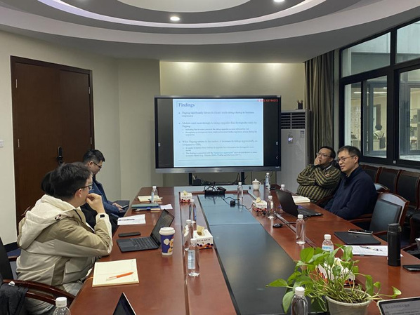 分享结束后,石劲老师与女友 张铭心老师、邱伟松老师、王伟佳老师、卞咏老师热情的交流了数据处理、论文选题、论文写作上的经验。关于张铭心老师在数据挖掘方面的问题,石劲教授教授针对性的给出了建议;关于邱伟松老师关于论文选题是否不够新颖的问题,石教授认为只要找到好的嵌入点,依然也能转化为一篇好文章;关于王伟佳老师由于论文数据局限性,实证难以做的完善的情况下,石老师建议可以转换思路,采用理论研究、或者数值模拟等方式来做;关于卞咏老师是否跟进两种最新方法跟进论文研究的问题,石劲老师也给出了自己的建议。